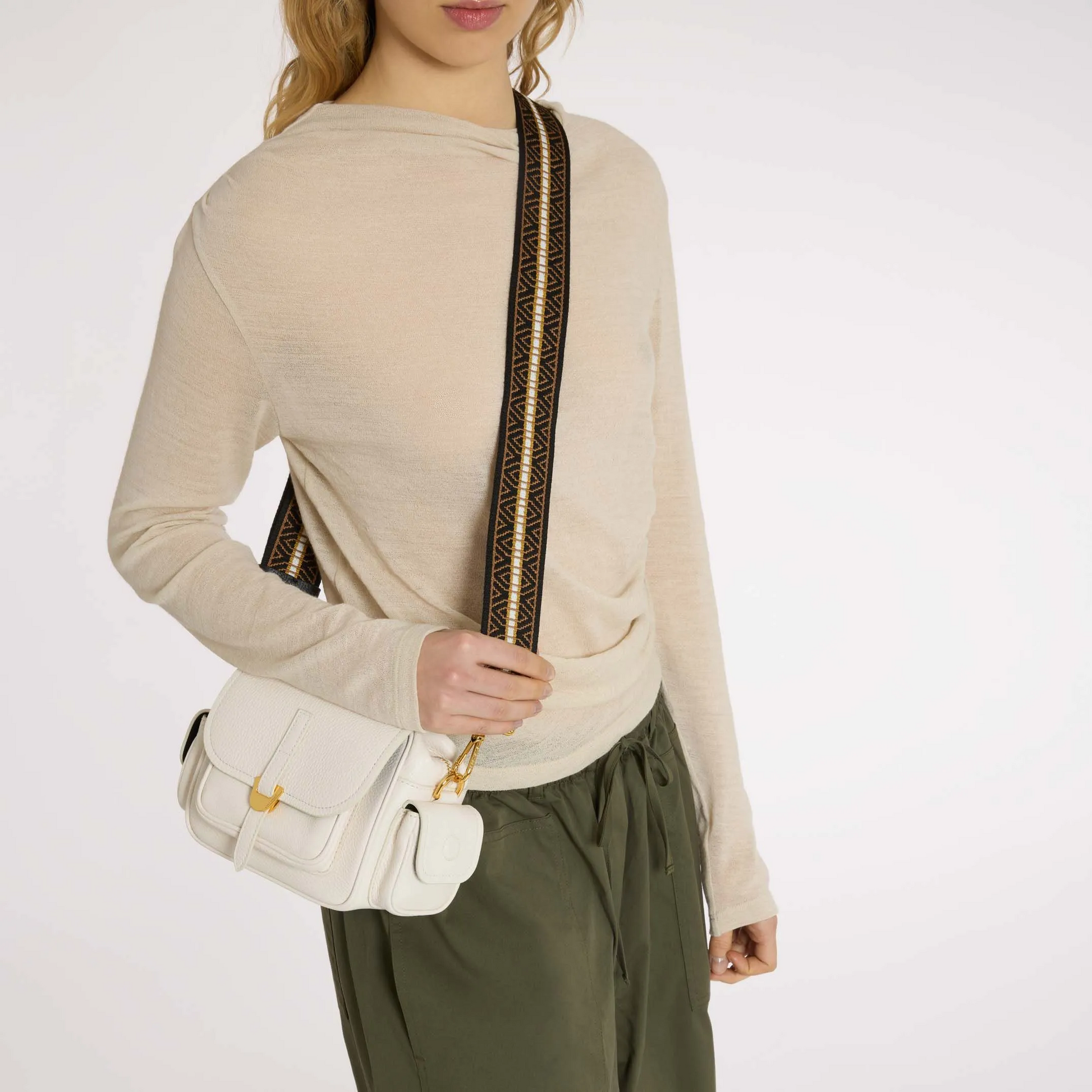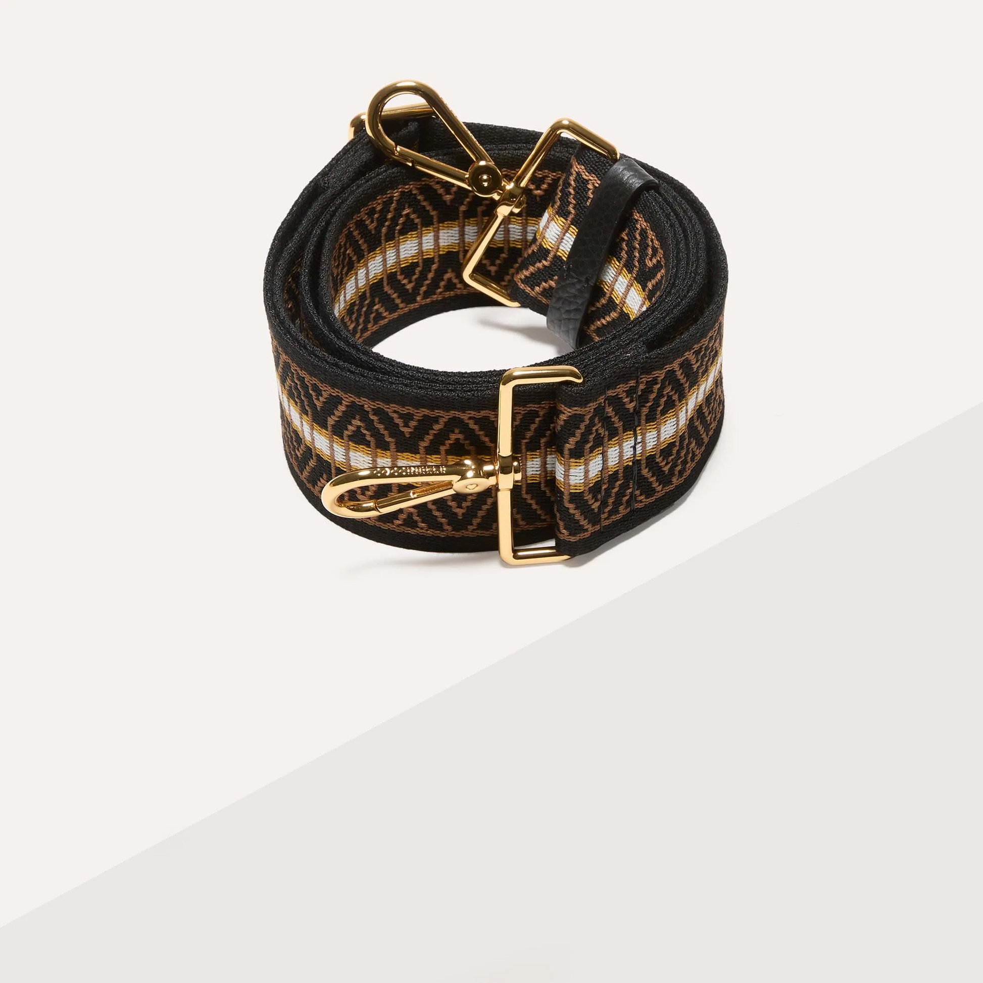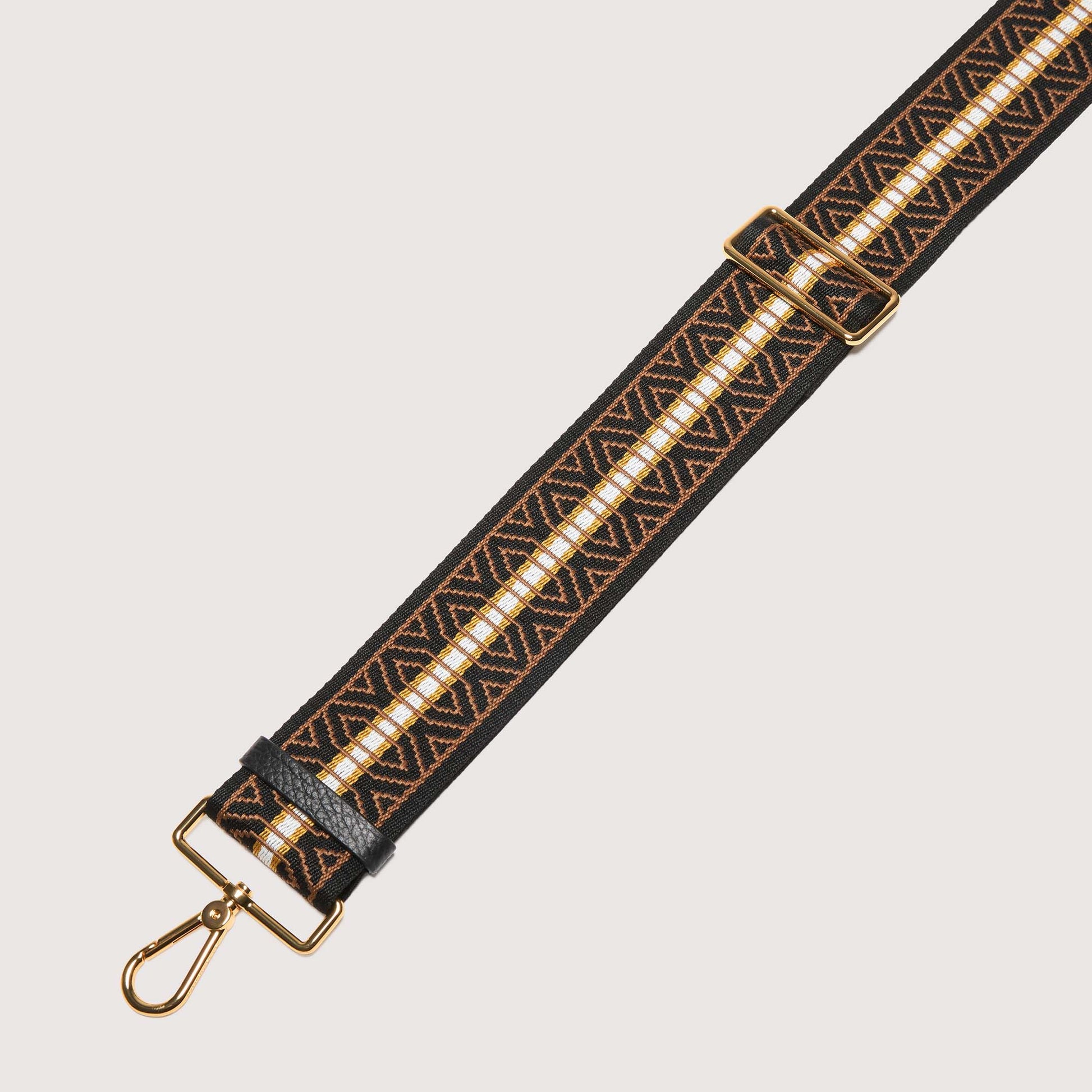 Тканинний плечовий ремінь з геометричним візерунком. Регулюється за допомогою пряжки. Ідеально підходить для персоналізації вашої сумки. Жаккардова тканина виготовляється на спеціальному ткацькому верстаті, що здатен виконувати складні малюнки. Після виготовлення ця тканина проходить подальшу обробку: з виворітного боку наноситься розчин проти осипання ниток, а з лицьового — водовідштовхувальний розчин. Чистити білою бавовняною тканиною, ледь змоченою водою, і дати висохнути.