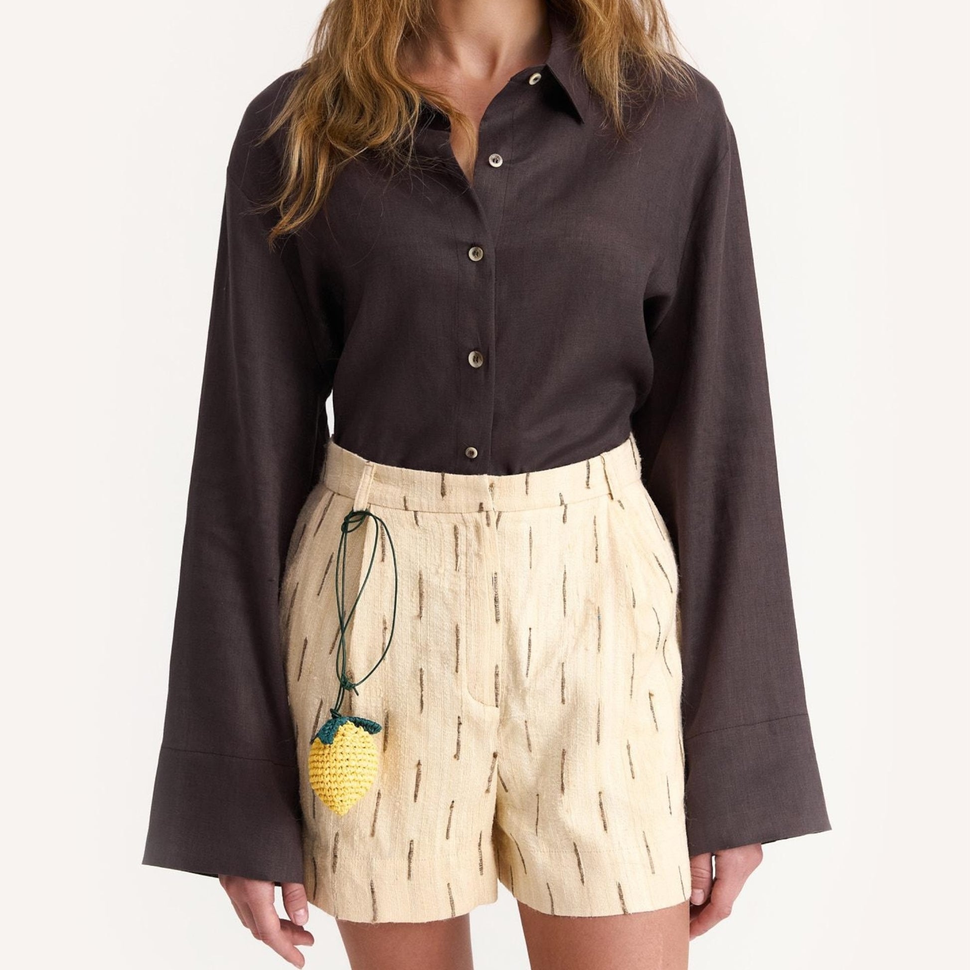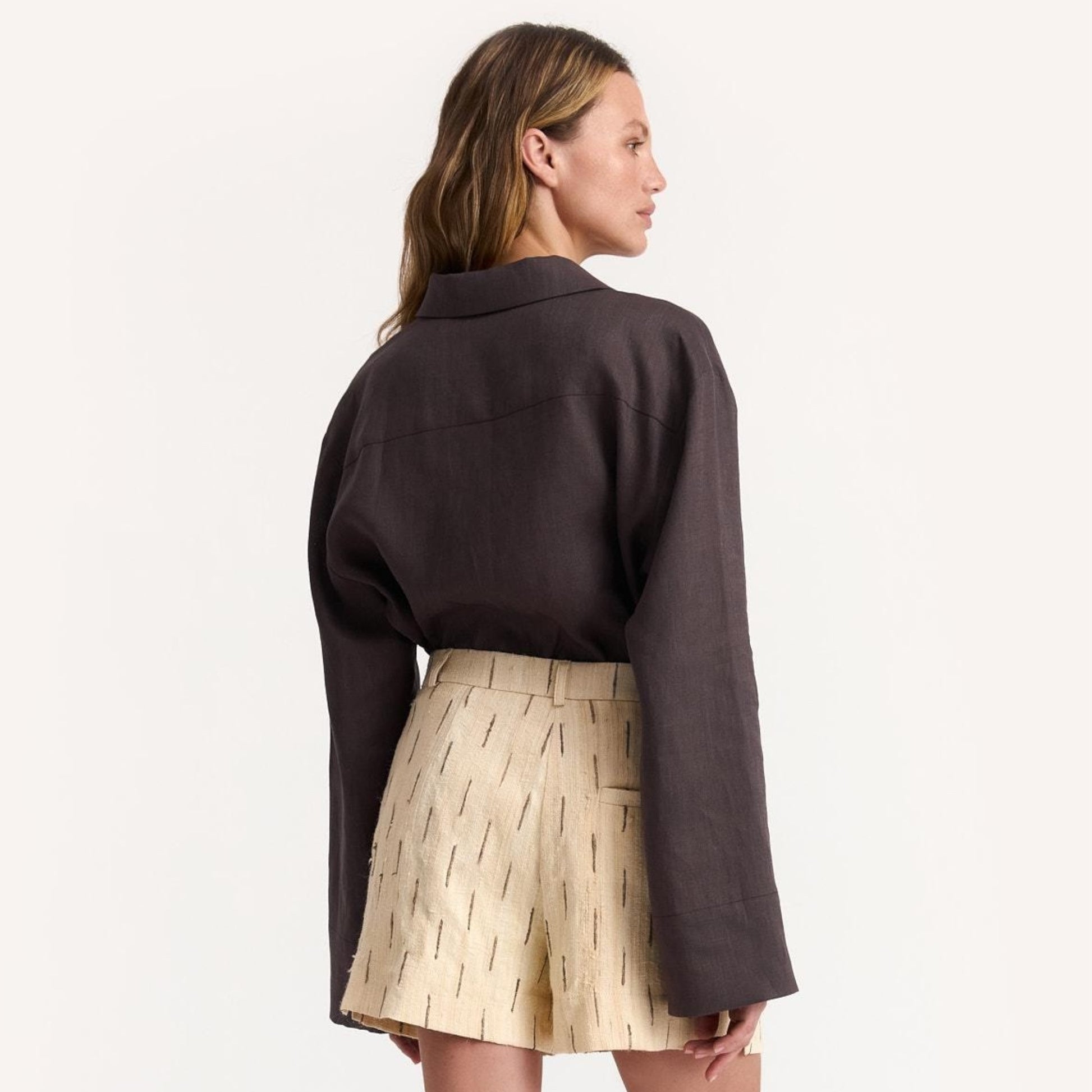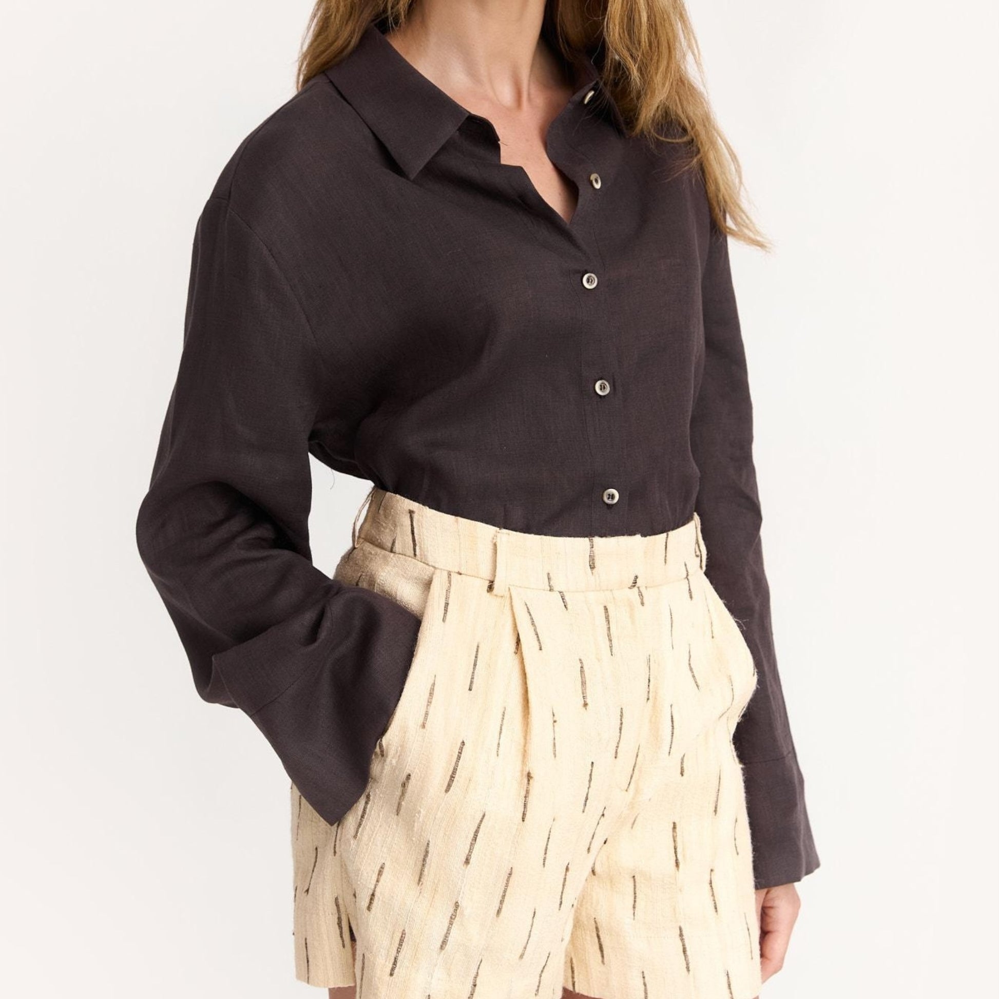 Сорочка глибокого коричневого відтінку вільного крою з льону. Має злегка розширений рукав, класичний комір і застібку на ґудзики. Натуральна тканина забезпечує комфорт у спеку та тримає форму.