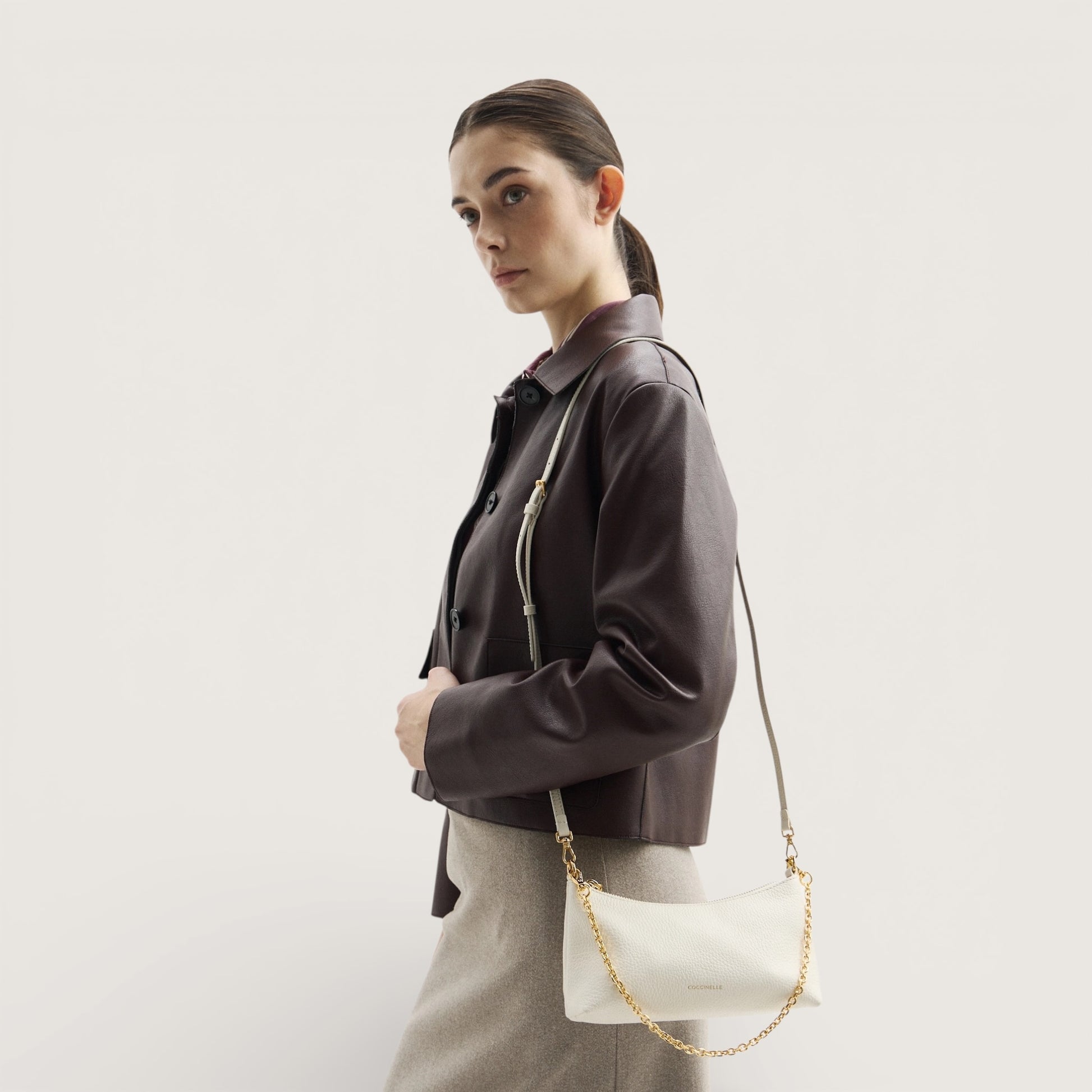 Мінісумка Coccinelle Aura поєднує сучасний дизайн і універсальність, що робить її ідеальним вибором на щодень. Зручний шкіряний плечовий ремінь забезпечує комфортне носіння протягом дня, а витончена ручка-ланцюжок додає елегантності та дозволяє легко адаптувати модель до вечірніх образів. Сумка виготовлена з високоякісної натуральної шкіри, обробленої за спеціальною технологією для збереження м’якості. Матеріал вирізняється міцністю, зносостійкістю та простотою у догляді, що робить модель практичною для щоденного використання.