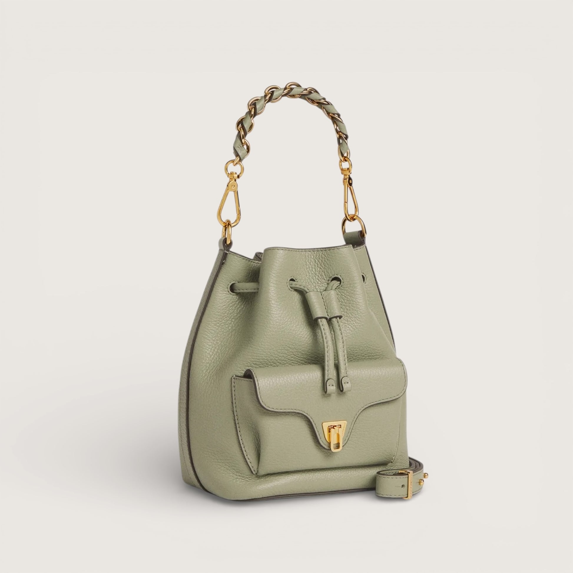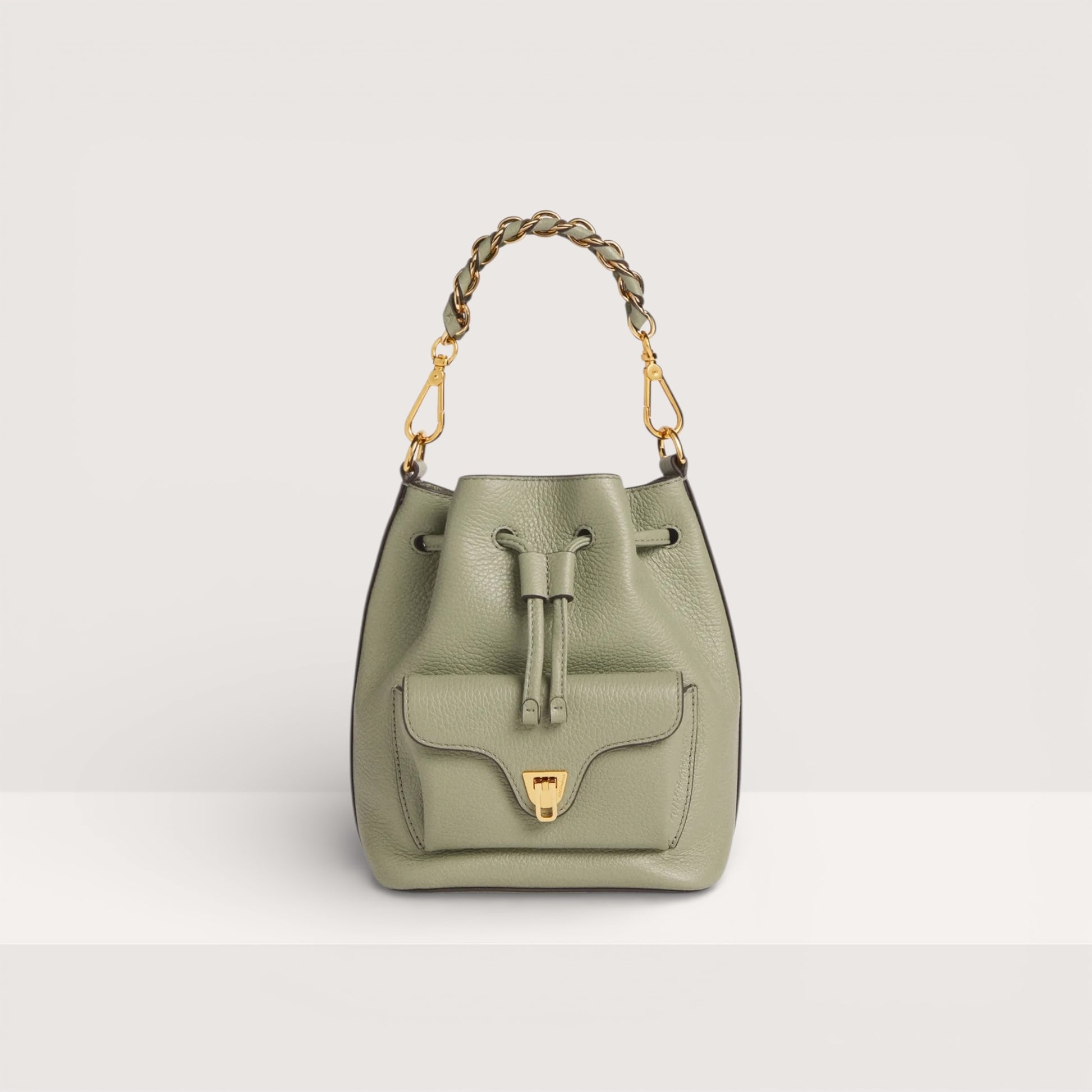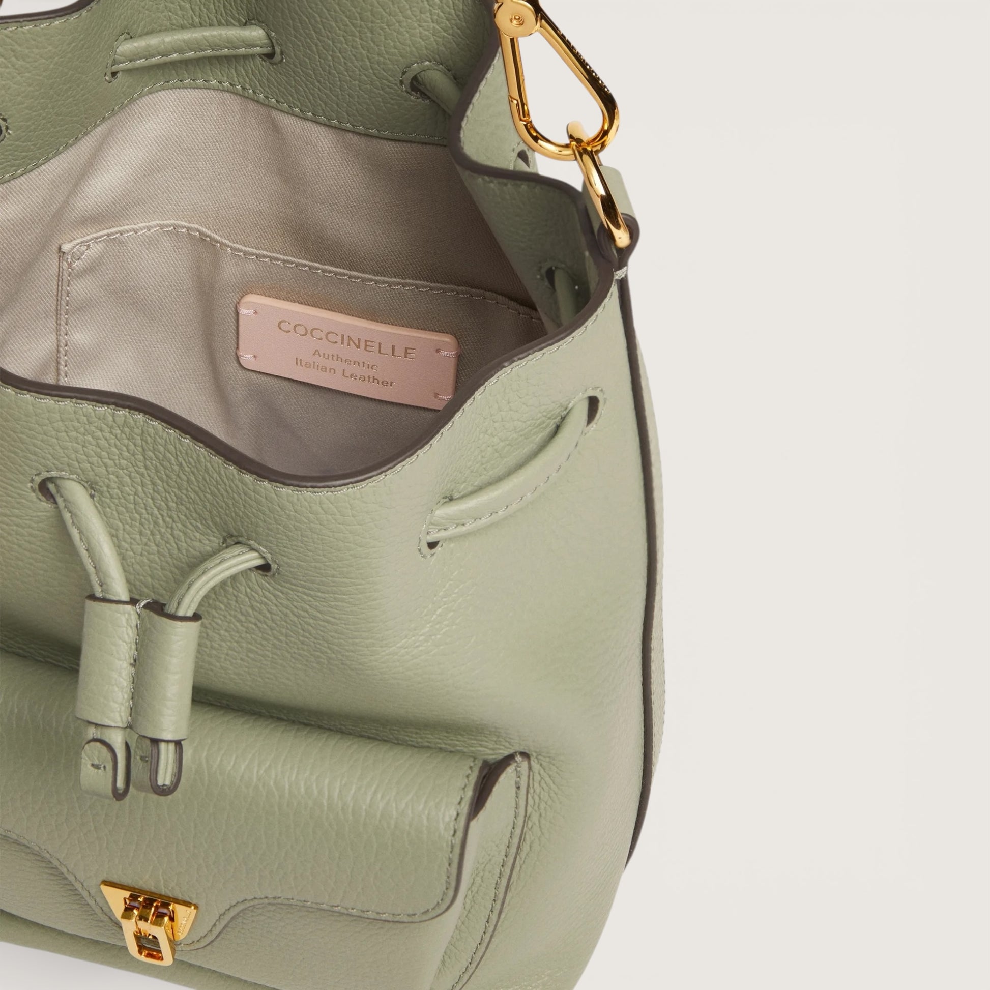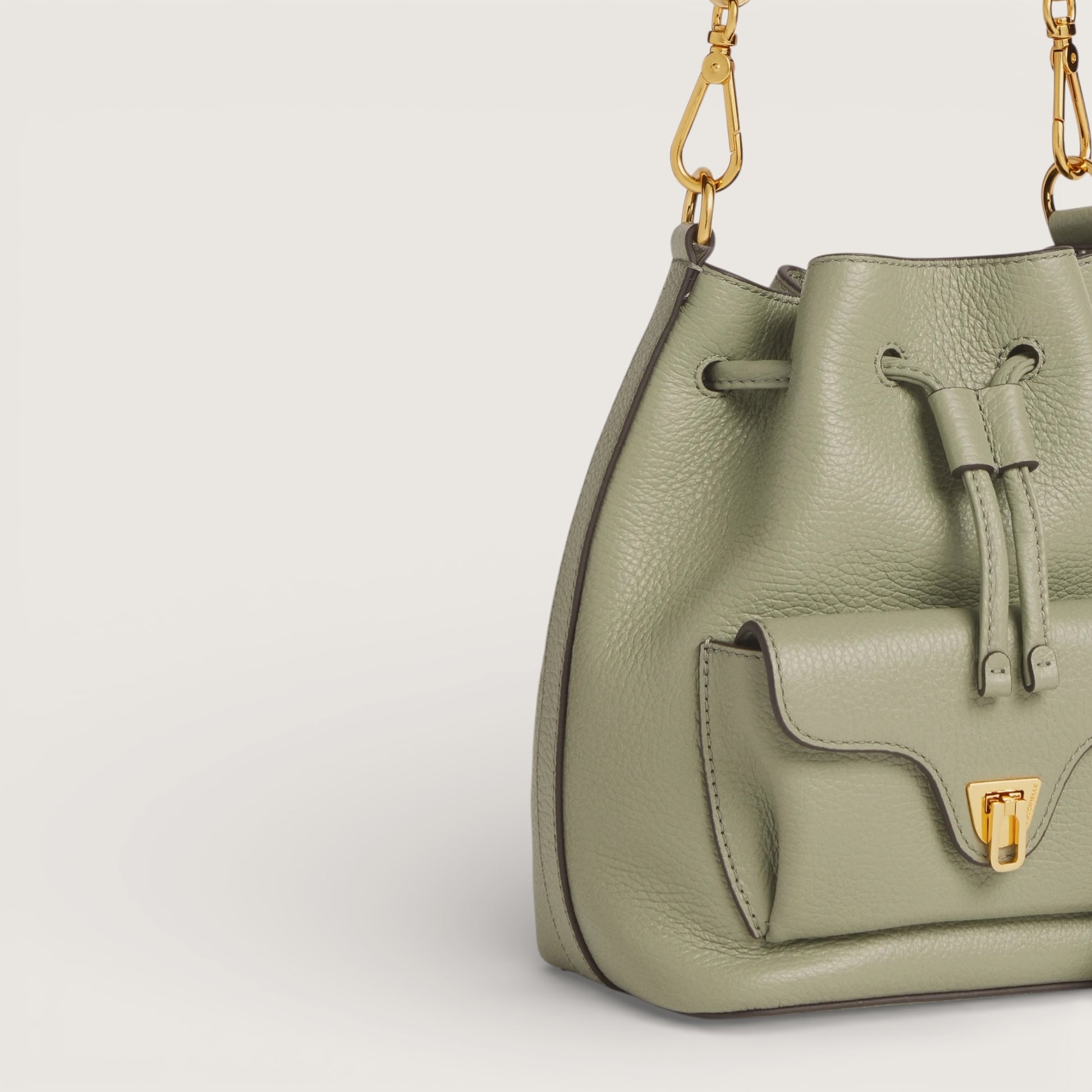 Лінія Coccinelle Beat — одна з іконічних у бренду. Характерна застібка-клапан із медіатором є символом ідентичності Coccinelle та в цій колекції переосмислена з елегантною, сучасною функціональністю. Мінісумка-«відерце» доповнена ручкою з поєднанням шкіри та ланцюжка — ідеальний баланс структури й м’якості, практичності та сучасного дизайну. Модель виготовлена зі шкіри, обробленої на спеціалізованому обладнанні та додатково пом’ятої для збереження м’якості. Це дуже міцна й легка в догляді шкіра, що робить сумку ідеальною для щоденного використання.