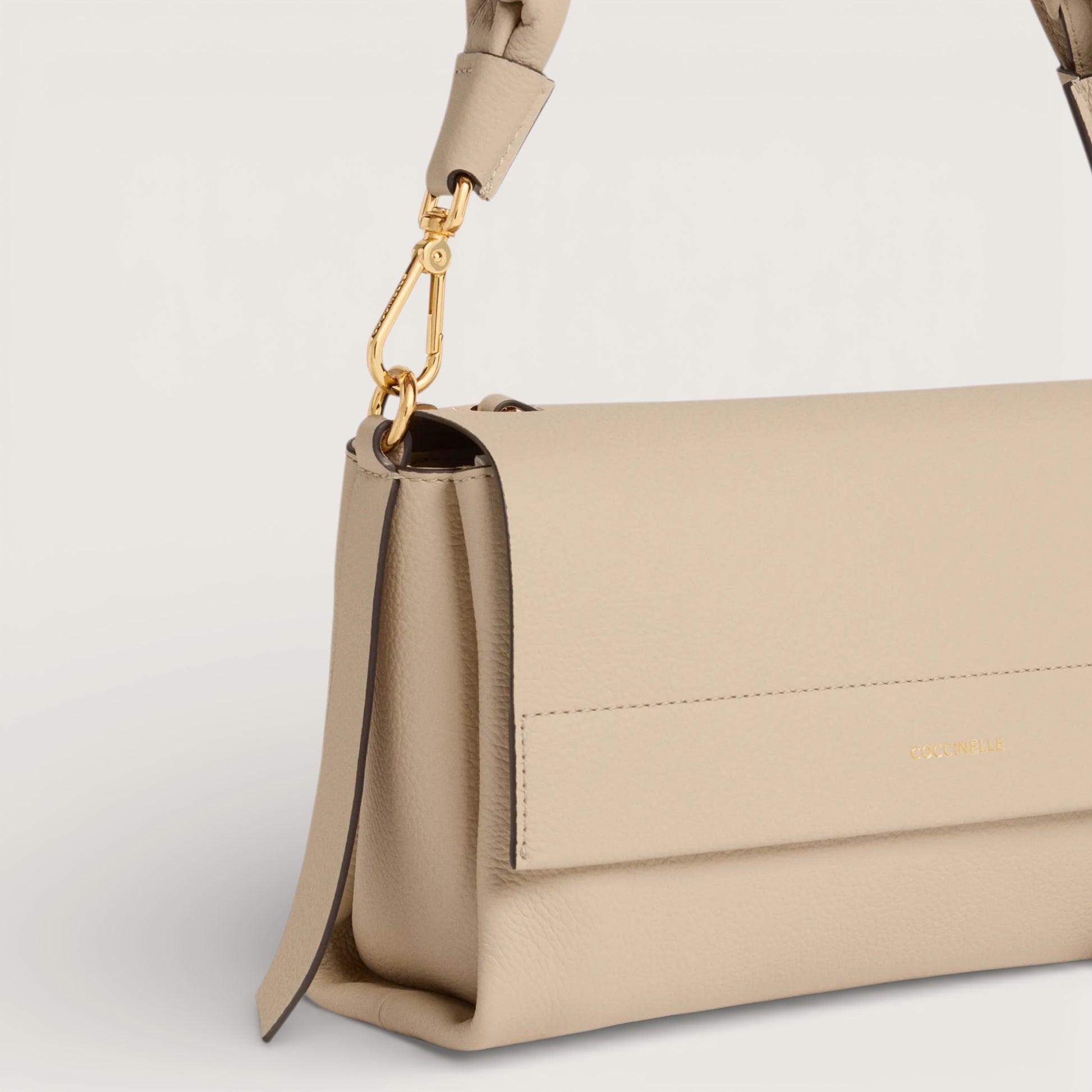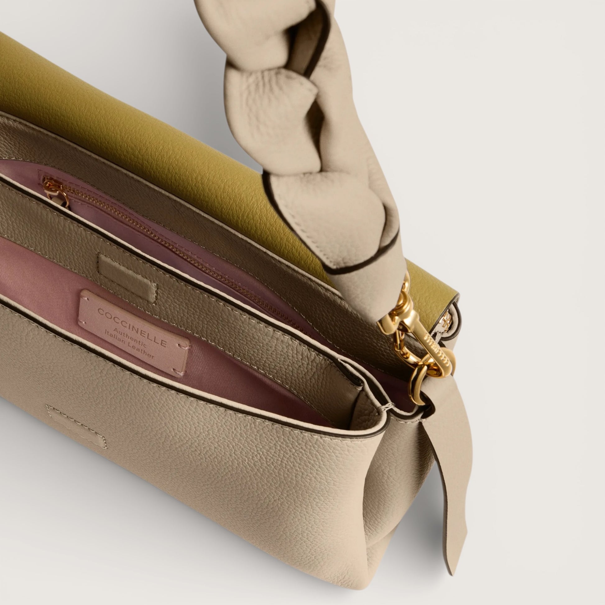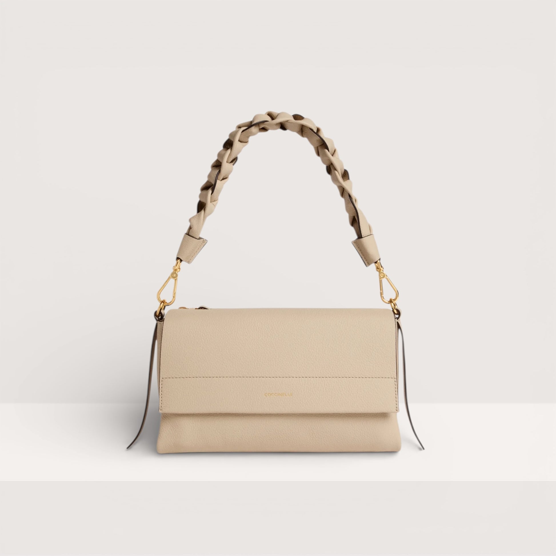 Coccinelle Boheme — лінія, створена з м’якої двосторонньої шкіри, що вирізняється плетеним ручним ремінцем, який надає моделі жіночності та сучасного характеру. Функціональна й містка, ця сумка ідеально підходить активним жінкам, які цінують комфорт і стиль. Виготовлена зі шкіри, що проходить спеціальну машинну обробку та м’який тумблінг, завдяки чому отримує надзвичайно ніжну текстуру. Особливість матеріалу — покриття з обох боків, яке створює ефект двосторонньої шкіри. Міцна та стійка до зносу, Boheme чудово підходить для щоденного використання.