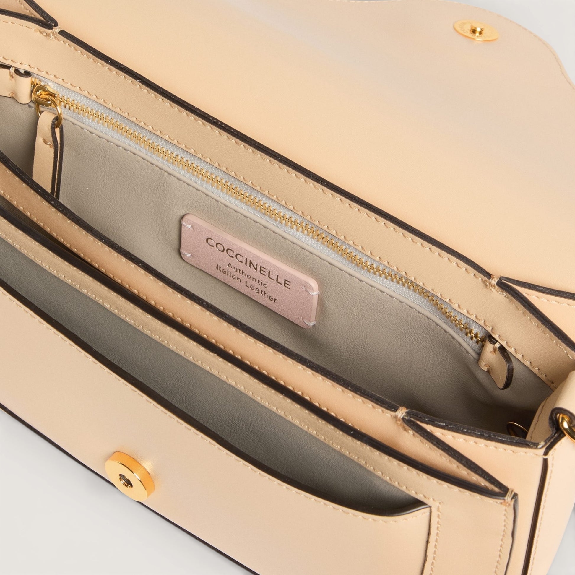 У колекції Coccinelle з’являється новий знаковий елемент – C-Me. Логотип переосмислено: літера «C» із назви бренду витончено огортає і переплітається з медіатором – культовим символом Coccinelle, що уособлює нерозривний зв’язок між минулим і теперішнім у житті жінки. Геометричні лінії та елегантні вигини підкреслюють дизайн, а конструкція з ластовицями поєднує в цій сумці функціональність і стриману елегантність, призначену для того, щоб бути незамінним супутником жінки Coccinelle протягом усього дня. Модель виготовлена з гладкої шкіри, що пройшла спеціальне тиснення з маслами, що надає їй довговічності та витонченого вигляду.
