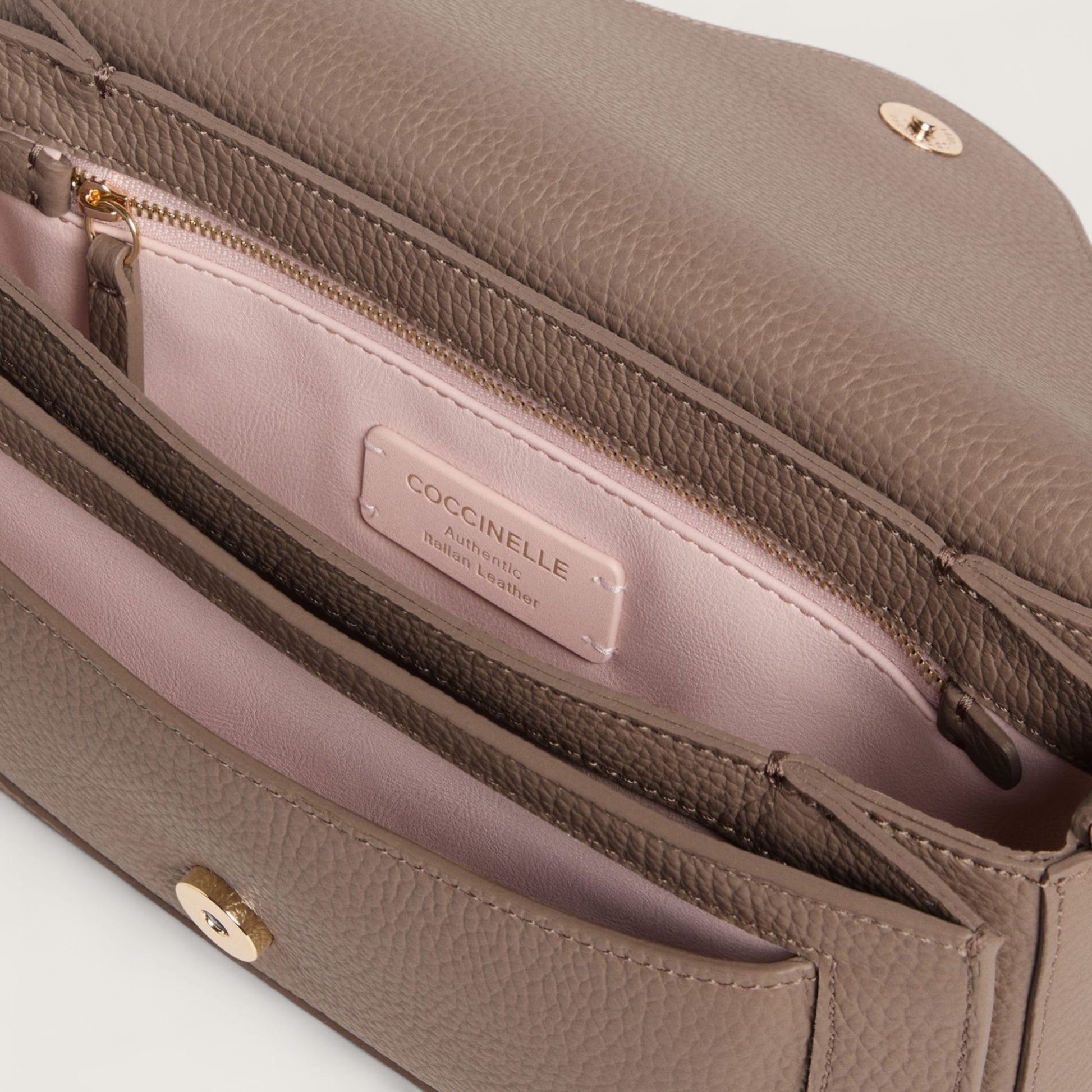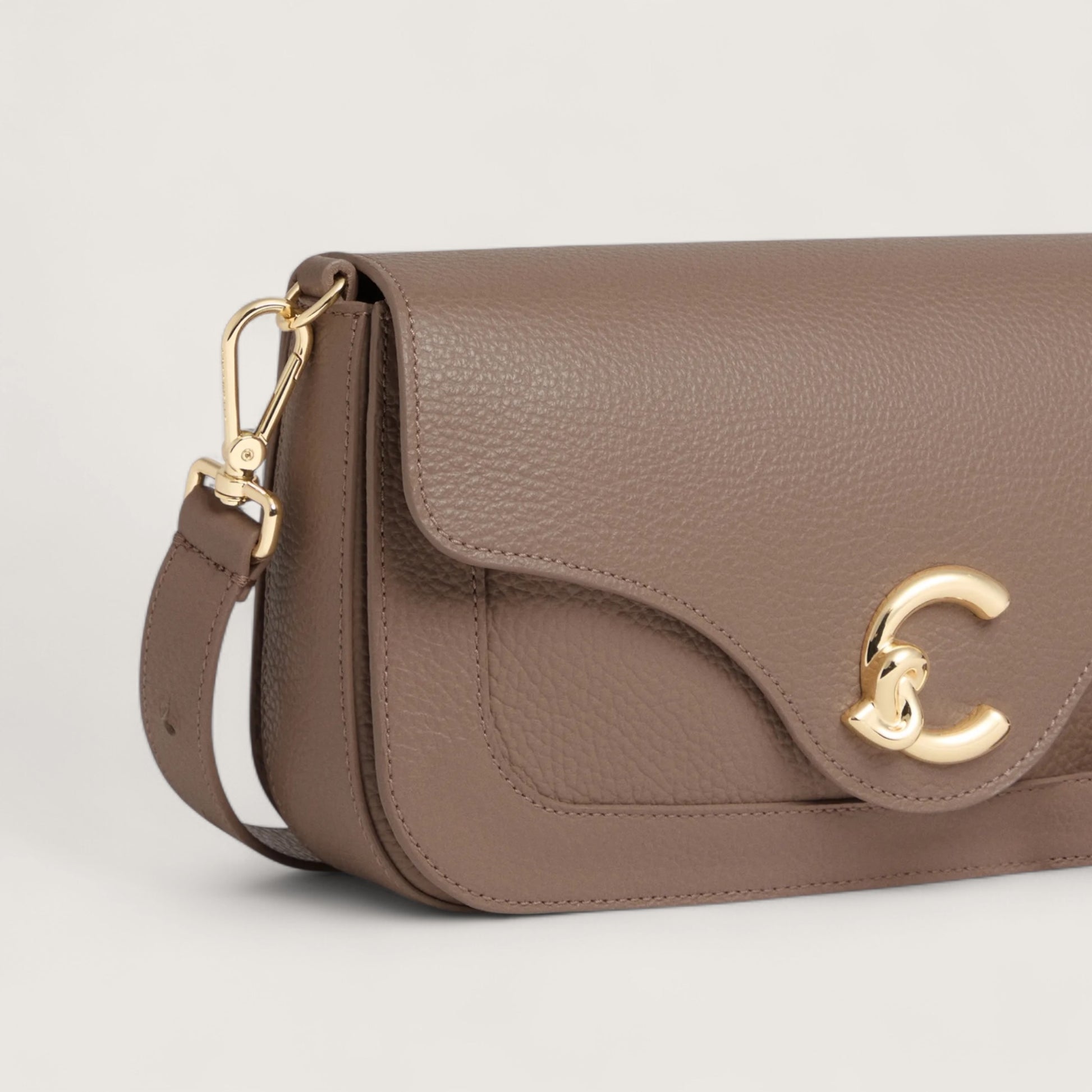 Coccinelle C-Me — новий фірмовий символ бренду. Літера “C” обвиває медіатор — знаковий елемент Coccinelle, уособлюючи зв’язок між минулим і сучасністю в житті жінки. Геометричні лінії та витончені вигини підкреслюють сучасний характер моделі, а складна бокова конструкція (gusseted) додає зручності й стриманої елегантності. Ця сумка задумана як універсальний супутник жінки протягом усього дня. Виготовлена зі шкіри, що проходить спеціальну машинну обробку, завдяки чому зберігає свою природну м’якість. Матеріал міцний, стійкий до зносу й легкий у догляді, тому сумка чудово підходить для щоденного використання.