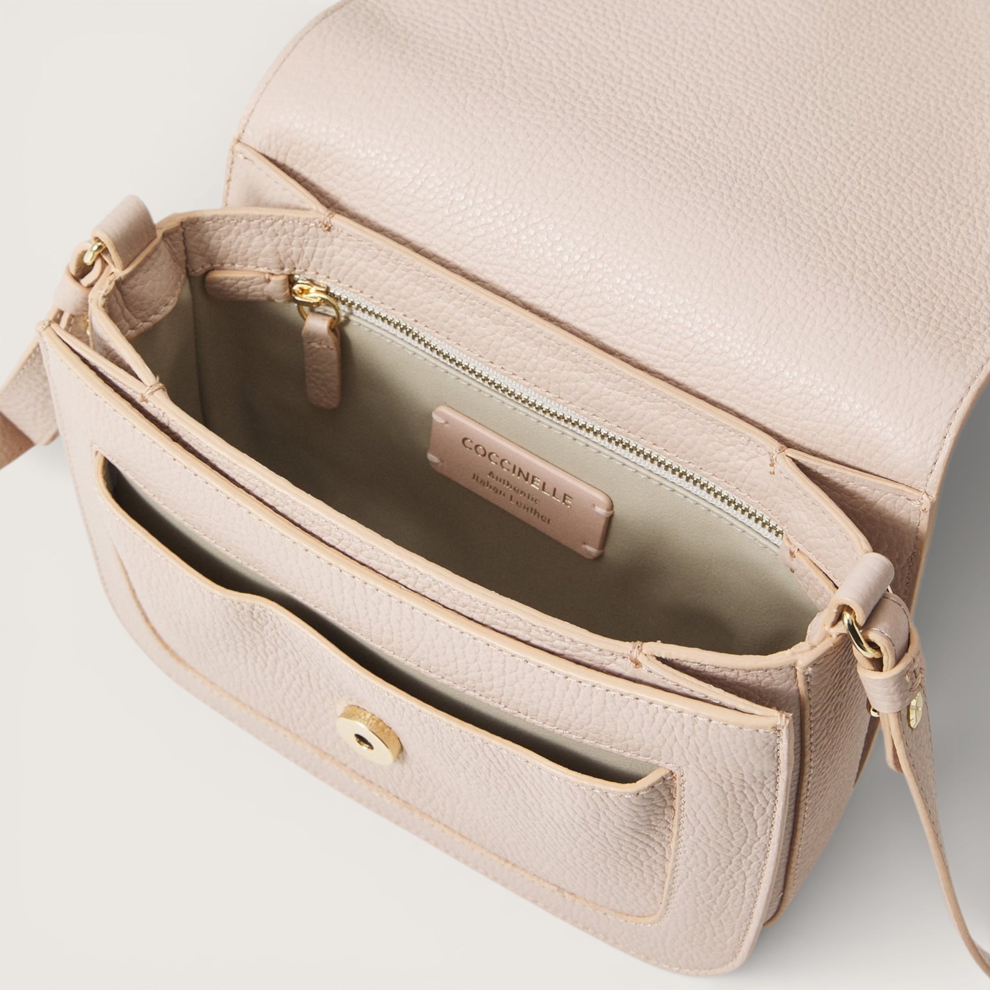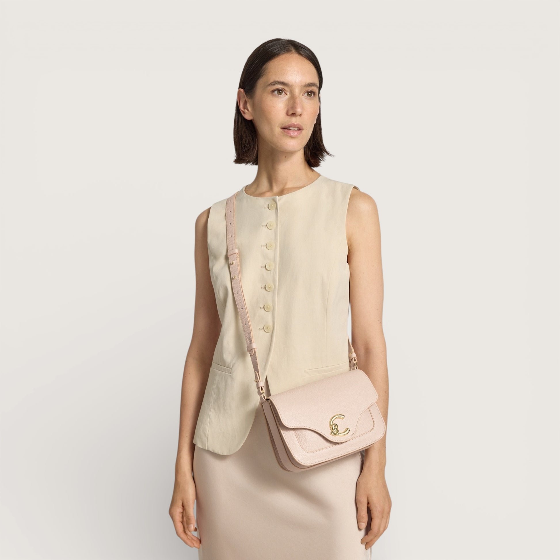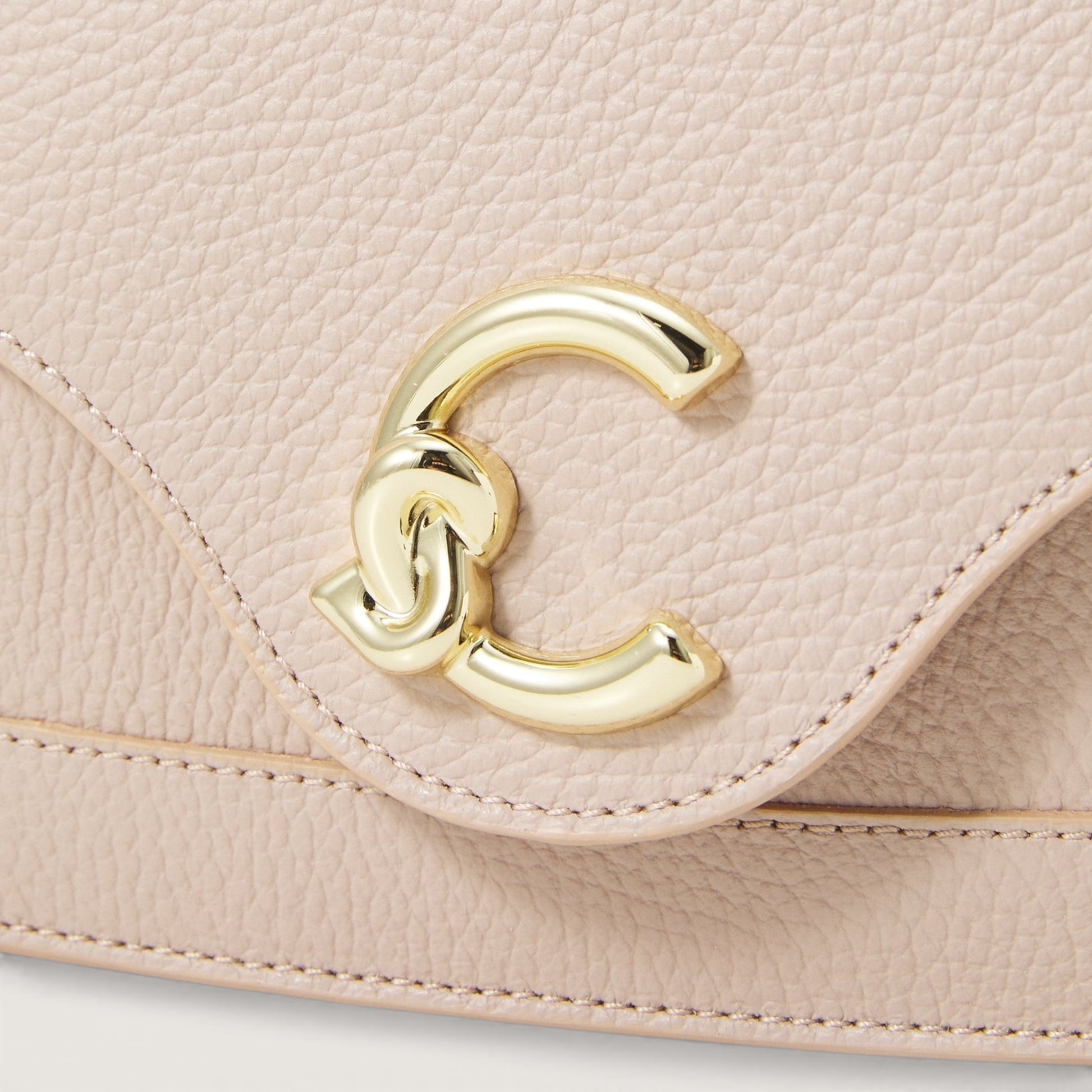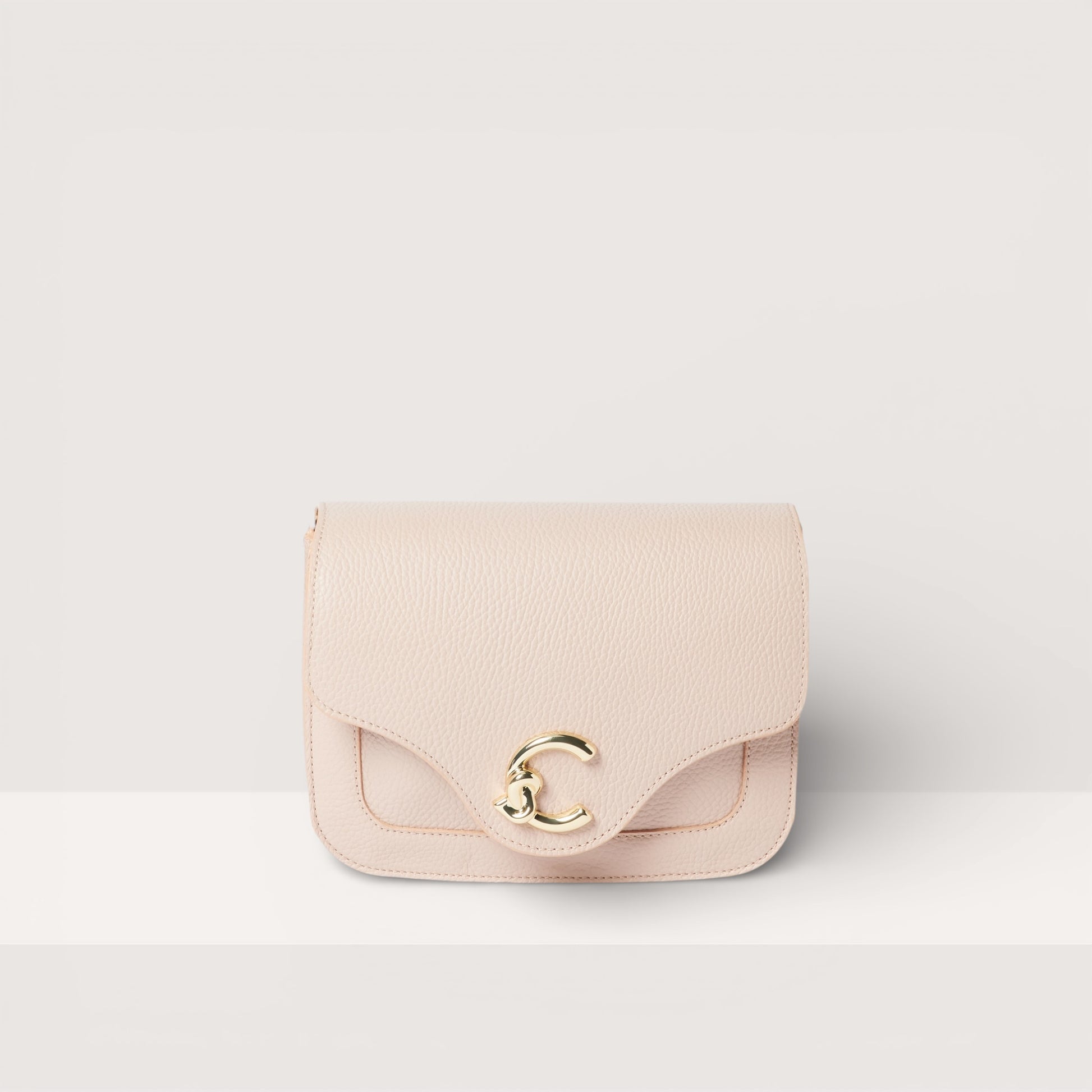 У колекції Coccinelle з’являється новий знаковий елемент – C-Me. Логотип переосмислено: літера «C» із назви бренду витончено огортає і переплітається з медіатором – культовим символом Coccinelle, що уособлює нерозривний зв’язок між минулим і теперішнім у житті жінки. Геометричні лінії та елегантні вигини підкреслюють дизайн, а конструкція з ластовицями поєднує в цій сумці функціональність і стриману елегантність, призначену для того, щоб бути незамінним супутником жінки Coccinelle протягом усього дня. Ця модель виготовлена зі шкіри, обробленої на спеціалізованих машинах, а потім вивернутої, щоб зберегти її м’якість. Це дуже міцна шкіра, яка легко чиститься, що робить її ідеальною для щоденного використання.