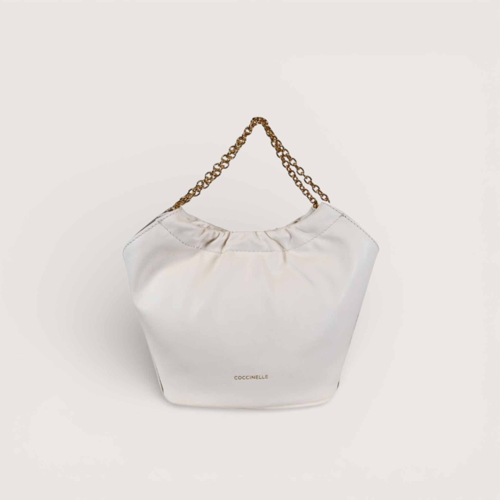 Лінія Coccinelle Smash втілює сучасний, жіночний характер бренду в його повній мірі. Легка гладка шкіра, зібрана металевим ланцюжком, утворює м’які складки, що надають моделі пластичного та витонченого вигляду. Логотип C-Me підкреслює дизайн і додає цій романтичній та місткій сумці індивідуального характеру. Для більшого комфорту ланцюжкові ручки доповнені шкіряною накладкою на плече. Модель виготовлена з гладкої шкіри, дубленої зі спеціальними оліями, які роблять її м’якою та приємною на дотик. Незважаючи на шовковистий вигляд, шкіра є стійкою до погодних умов завдяки використанню смол, що надають їй легких водовідштовхувальних властивостей, зберігаючи при цьому її природний вигляд.
