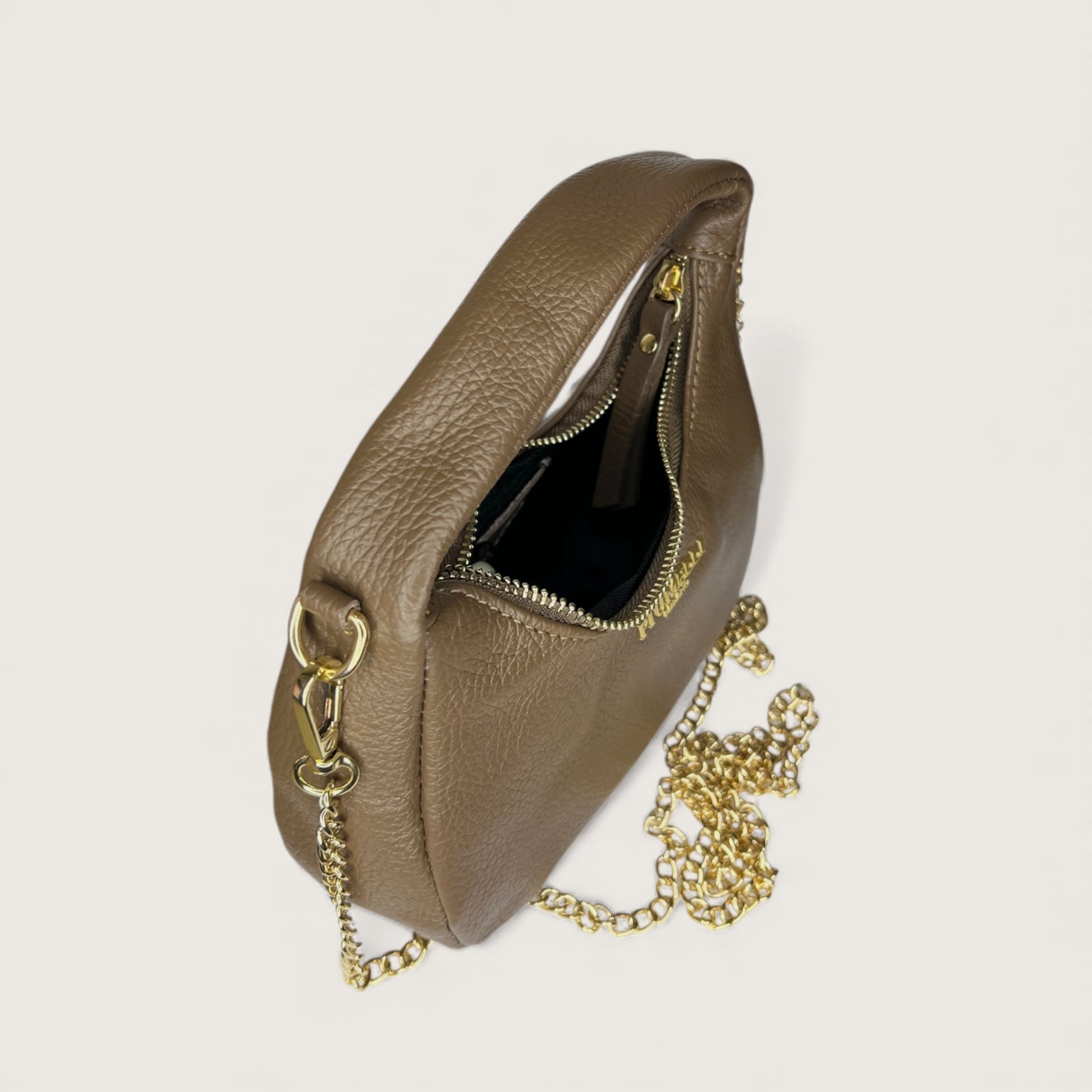 Сумка має плавний, м’який силует, що створює вишуканий і жіночний вигляд. Округла форма робить модель компактною, але водночас місткою — необхідні речі легко розташовуються завдяки продуманому внутрішньому простору. Шкіра зерниста, приємна на дотик текстура та мінімалістичні деталі підкреслюють стриманий елегантний стиль.