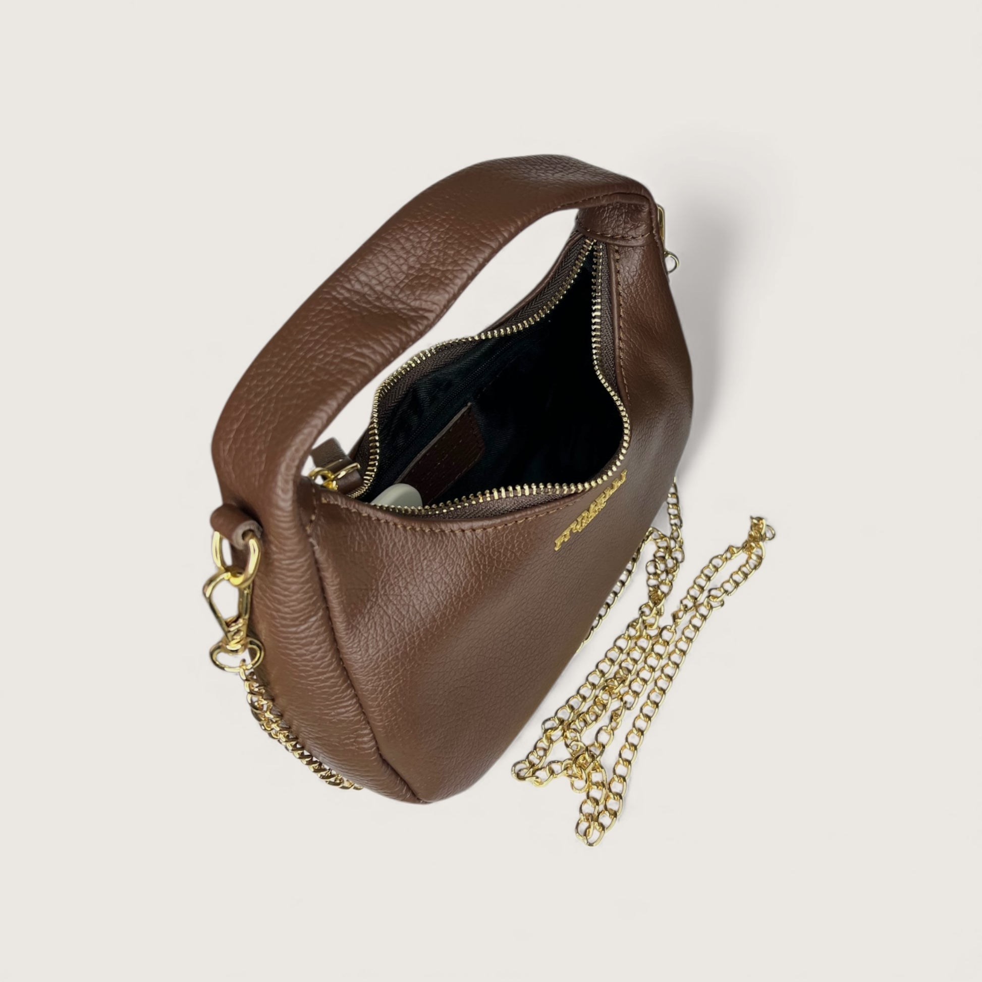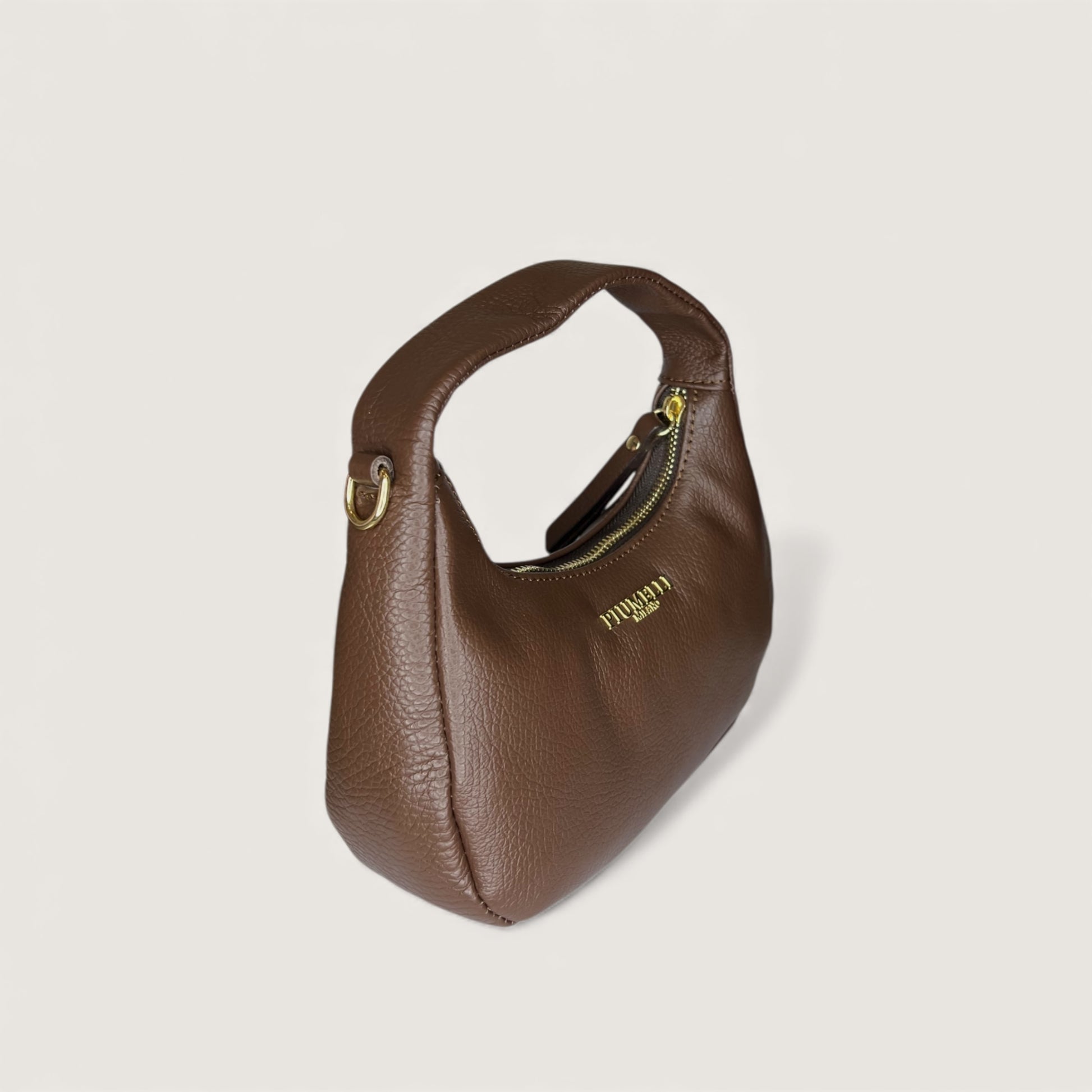 Сумка має плавний, м’який силует, що створює вишуканий і жіночний вигляд. Округла форма робить модель компактною, але водночас місткою — необхідні речі легко розташовуються завдяки продуманому внутрішньому простору. Шкіра зерниста, приємна на дотик текстура та мінімалістичні деталі підкреслюють стриманий елегантний стиль.