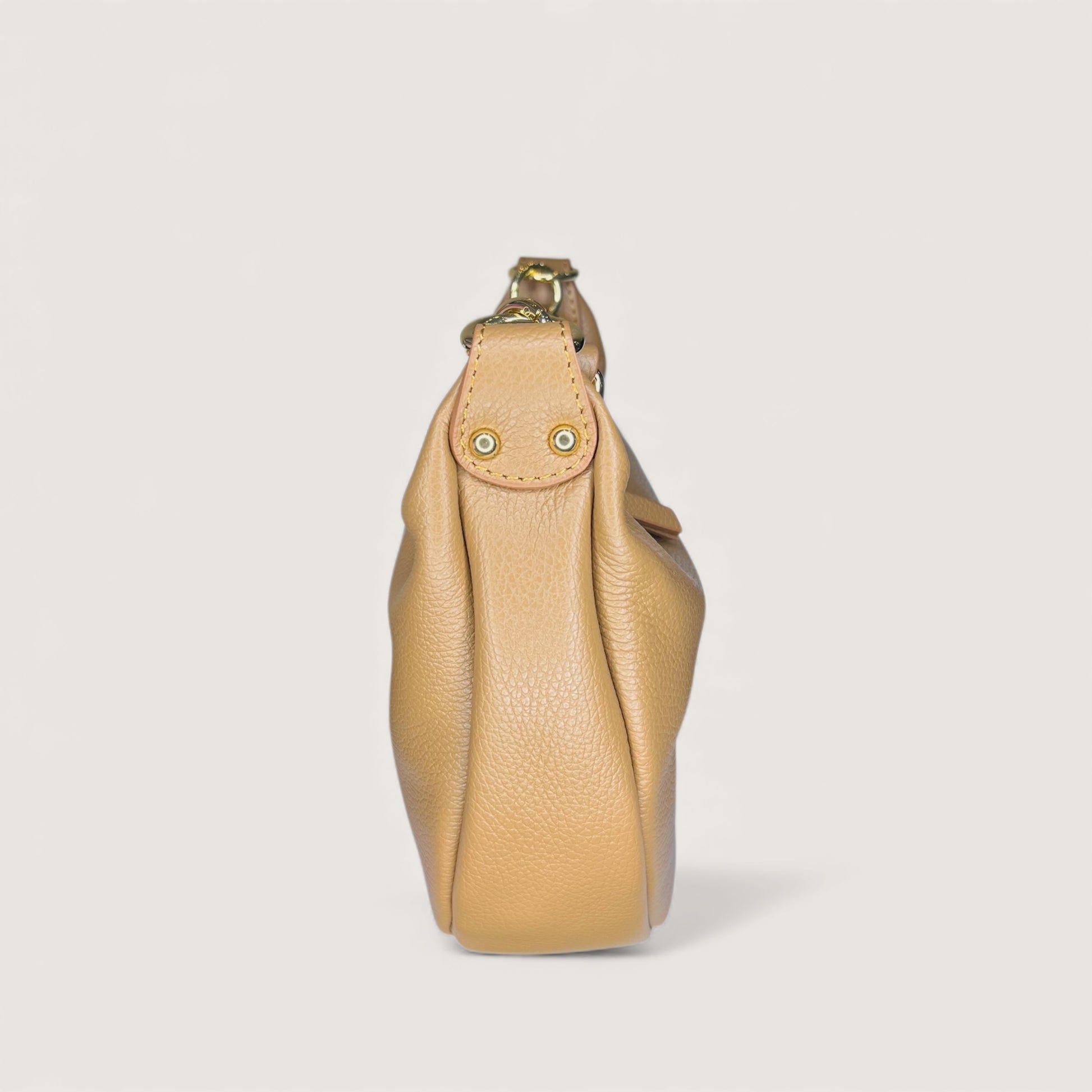 Сумка має плавний, м’який силует, що створює вишуканий і жіночний вигляд. Округла форма робить модель компактною, але водночас місткою — необхідні речі легко розташовуються завдяки продуманому внутрішньому простору. Зериста шкіра, приємна на дотик текстура та мінімалістичні деталі підкреслюють стриманий елегантний стиль.