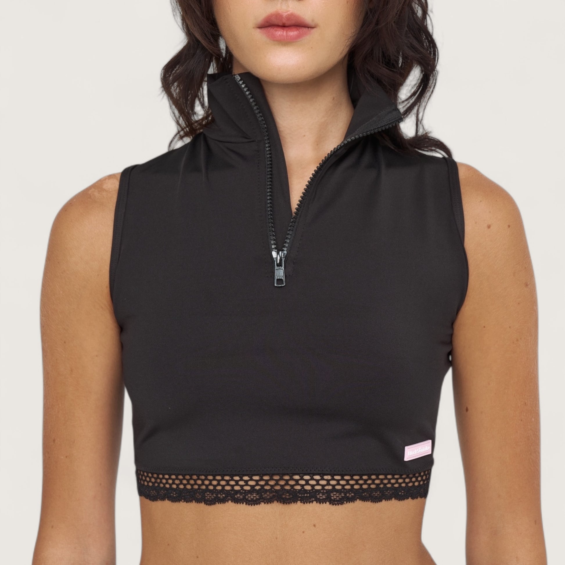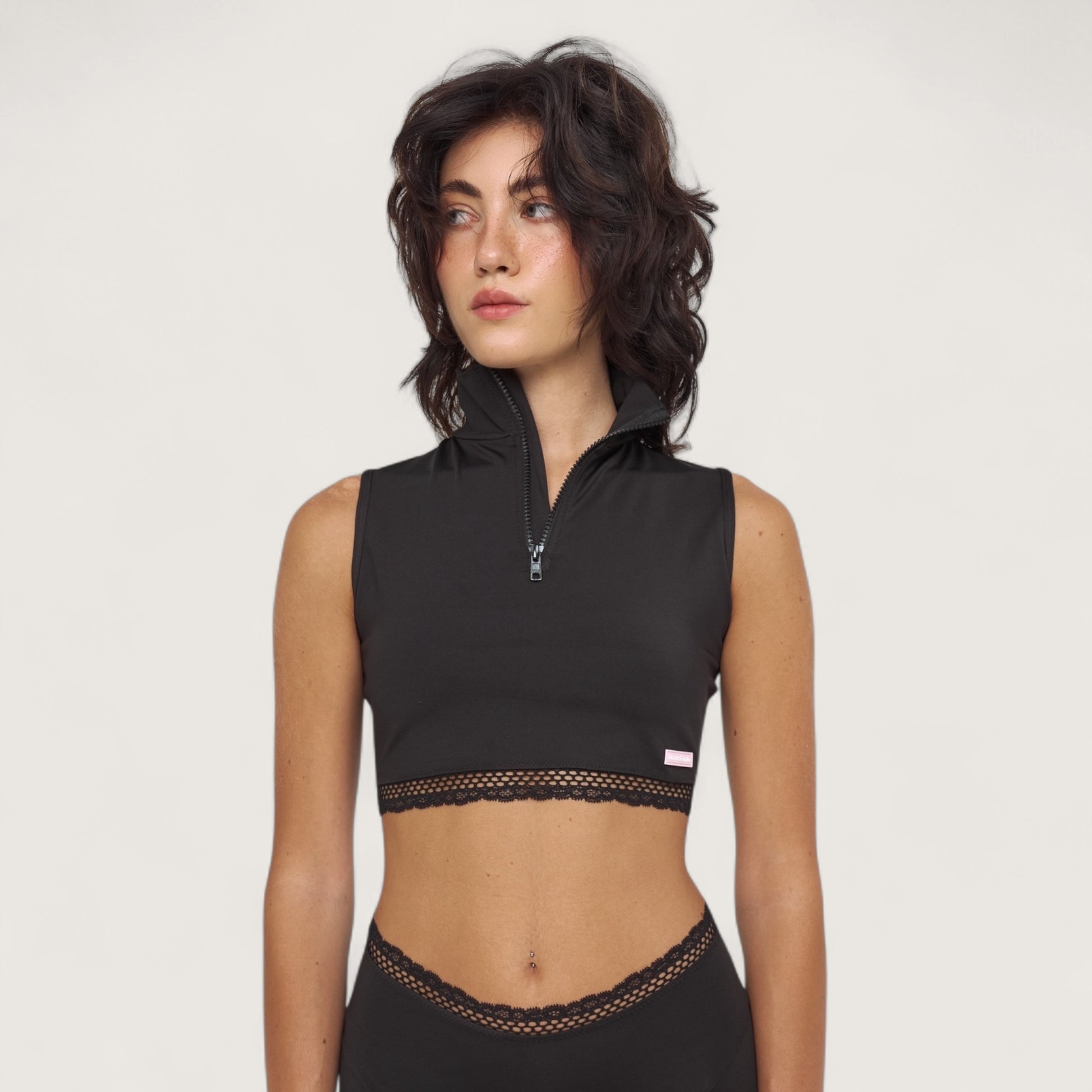 Топ Nuba у глибокому чорному кольорі поєднує функціональність й елегантність. Високий комір на блискавці. Тонке мереживо по лінії талії — білизняний елемент, що додає ніжності та делікатності образу. Топ легко інтегрувати в повсякденне життя — від ранкового спорту до вечірніх прогулянок.